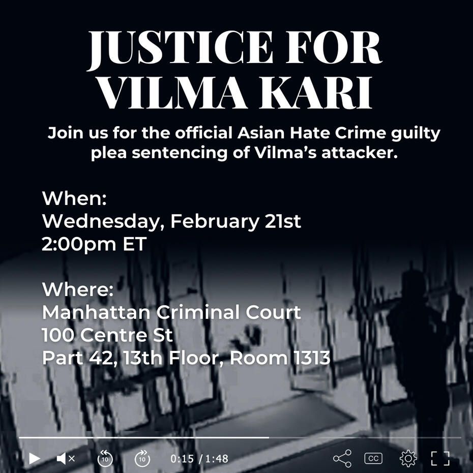 Hi. My name is Elizabeth Kari and I am the daughter of Vilma Kari, the 65 year old woman who was attacked on her way to church near Times Square, simply for being Asian. First and foremost, I want to thank everyone that has expressed their support. Through the gofundme page, we have received an overwhelming amount of private messages of prayers and love—which has shown us first-hand what the human spirit is capable of. Supporters sharing words of encouragement, their fears and even their own personal hate encounters —all of these stories have made us feel closer to the community and the world.